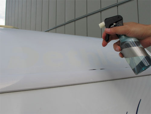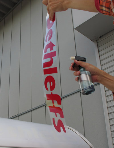 カッティングシートの台紙を取った側に、万遍なく霧吹きで濡らしてください。水分は多めの方が貼り付けの位置合わせがし易くなります。