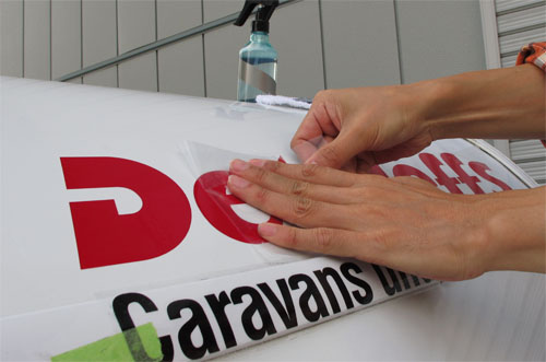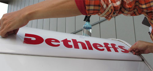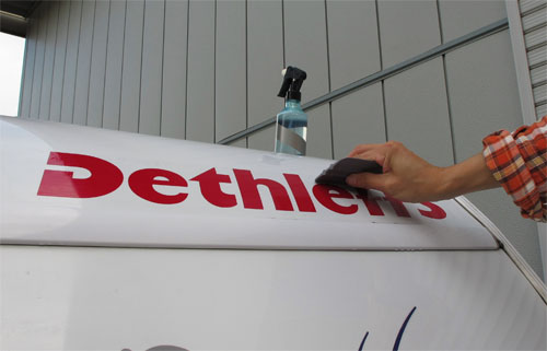 貼り付ける場所、カッティングシートーが十分に濡れてるのを確認し、貼りたい位置に合わせて、ゆっくりと貼り付けます。