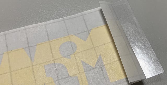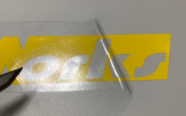 写真の様にステッカー部と転写シートを鋭角な角度で剥がしていきます。