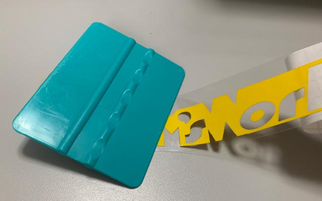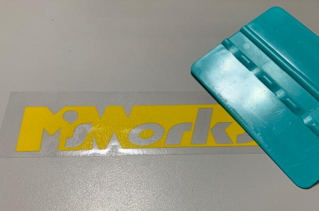 位置合わせが完了したら、スキージ等のヘラを使用しカッティングシート下にある、水分を出します。